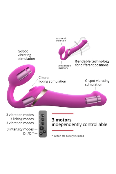 Ce gode ceinture est équipé de 3 moteurs indépendants contrôlables séparément et à distance à l’aide d'une télécommande dédiée.